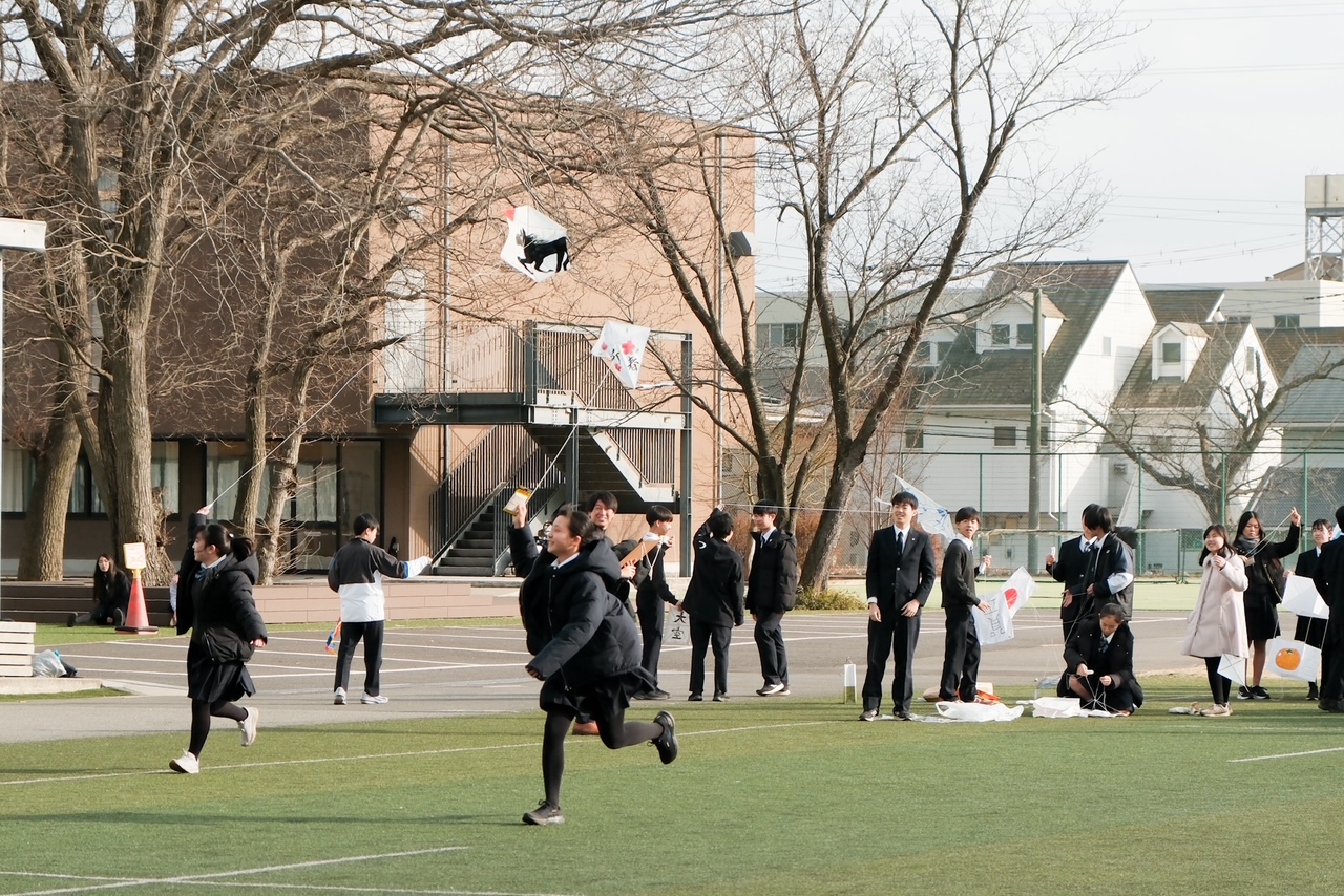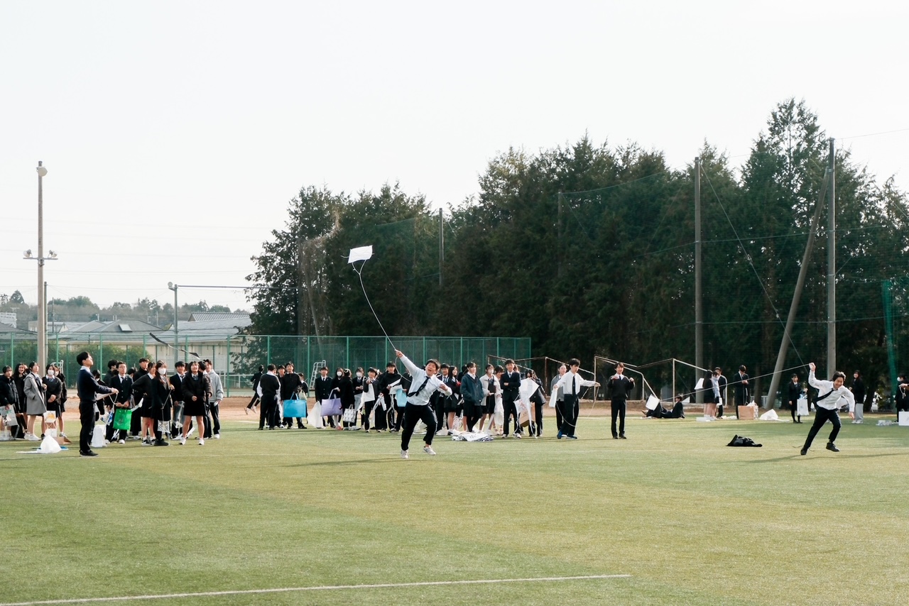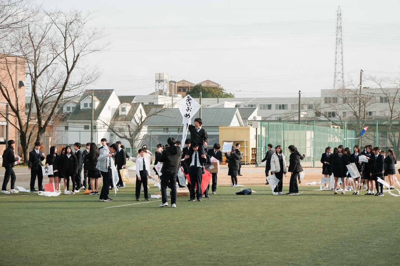 大会では、各クラス出席番号順に並んだ生徒たちが、グランドを思いっきり駆け回っていました。より高く揚げようとクラスで協力する姿や、凧が揚がる度に広がる歓声に、先生方や保護者も自然と笑顔になりました。